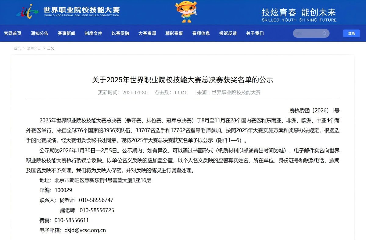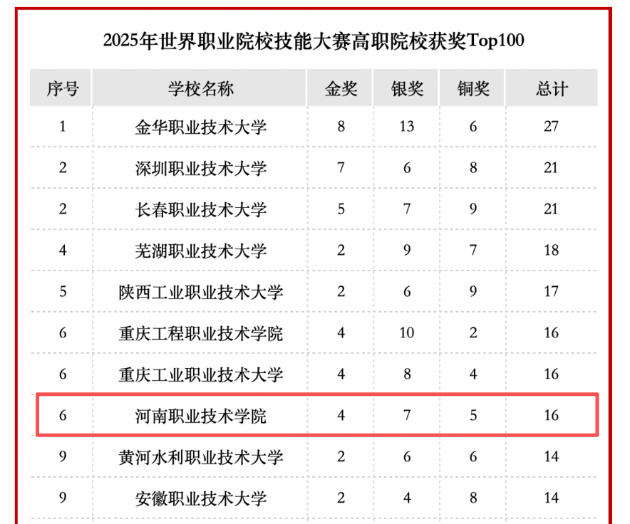 近日,世界职业院校技能大赛执行委员会权威发布了《2025年世界职业院校技能大赛总决赛获奖名单》。河南职业技术学院以4金、7银、5铜,共16项奖牌的优异成绩,与重庆工程职业技术学院、重庆工业职业技术大学并列全国第六位,位居河南省参赛院校首位,充分彰显学校在全国高等职业教育领域的领先实力与核心竞争力。